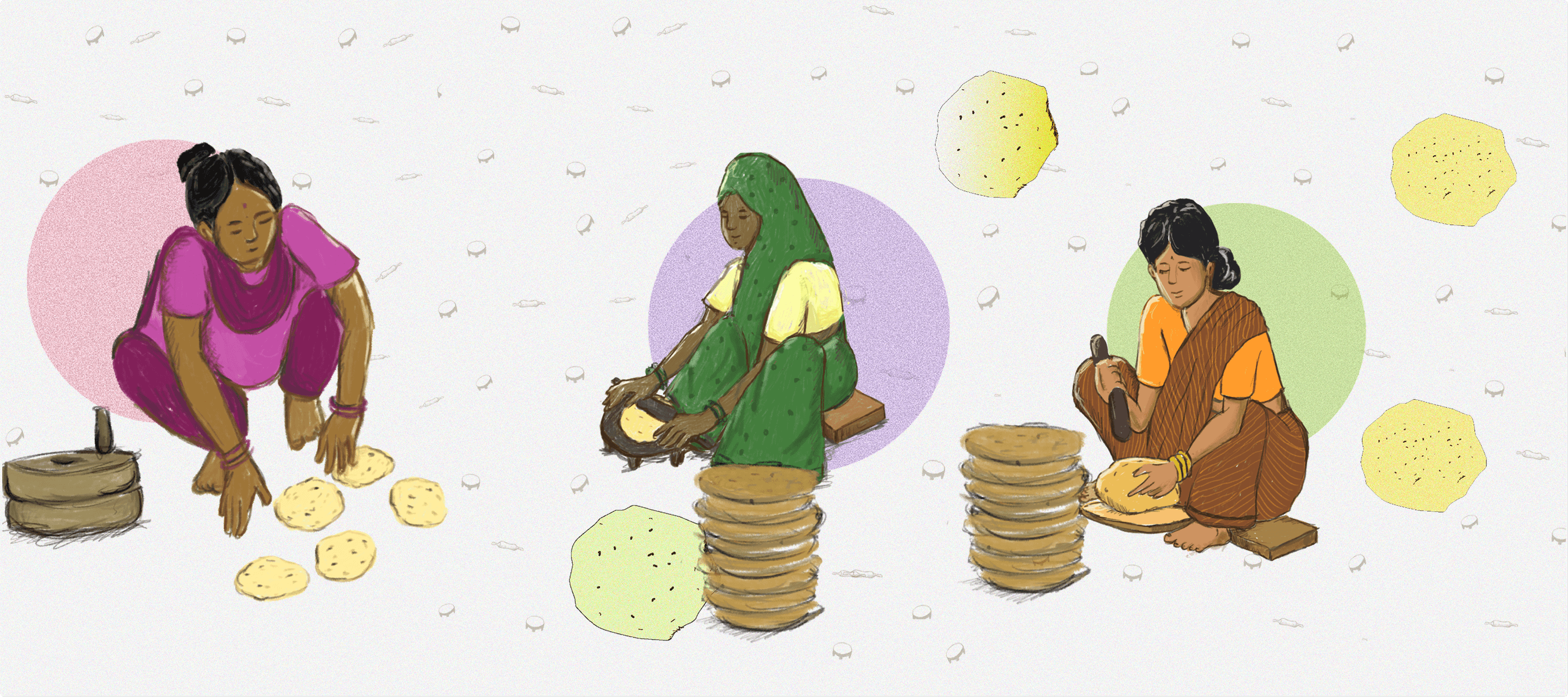 That visual language of hand-done humility, something raw yet thoughtful, shaped the direction of the logo. From initial hand-drawn forms, I chose Kunkun as the base typeface and built the final Devanagari logotype from there. Companion Latin logotype is custom-designed. The illustration style has women at the forefront. Women are the story of the brand. The overall visual system blends vibrant colours with soft monochrome tones, along with textures that evoke comfort and warmth. Together, these elements reflect the brand’s values of simplicity and humility.